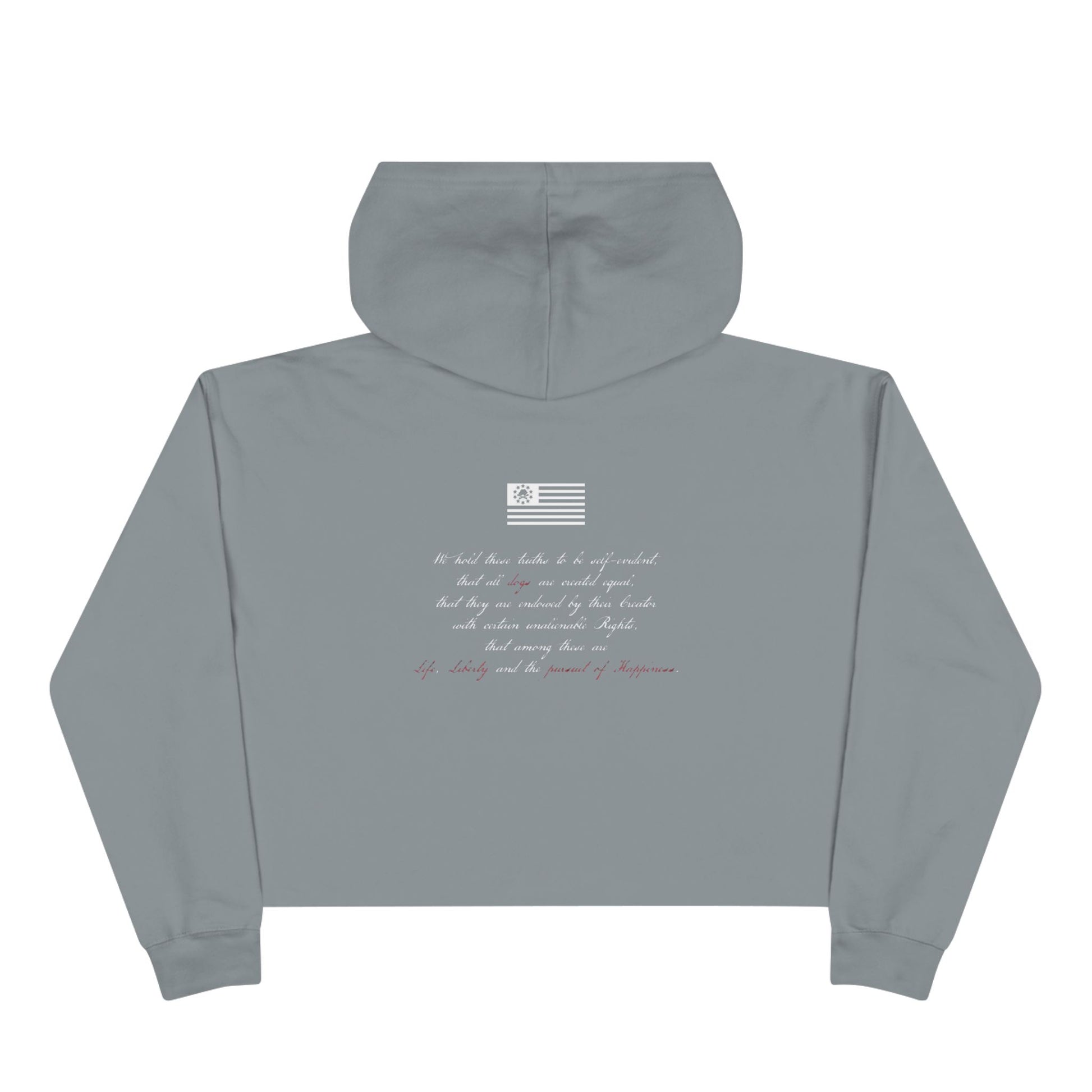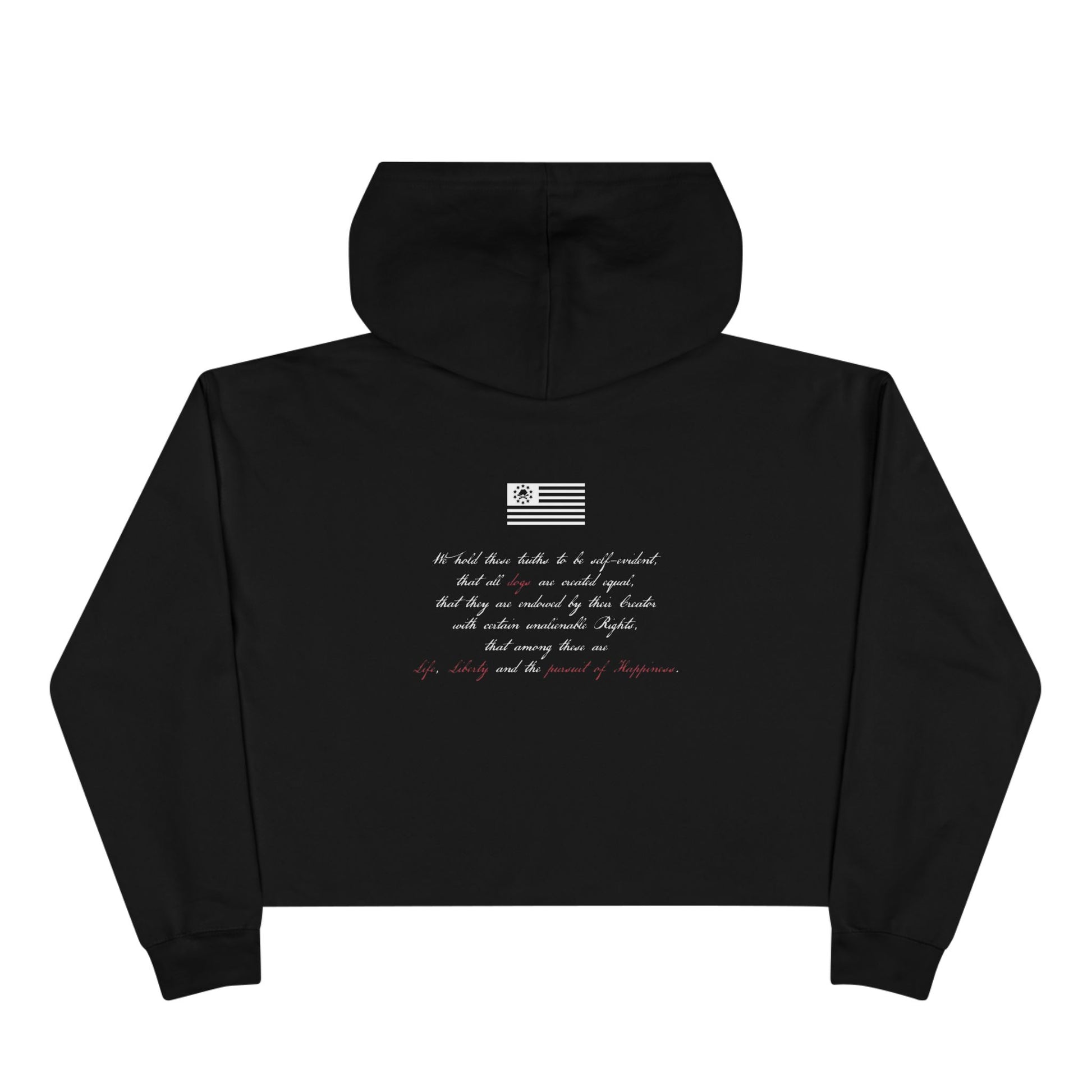 A cropped hoodie that feels lived-in from the first wear. Lightweight but substantial, its relaxed drop-shoulder shape and raw hem give it an effortless, street-ready silhouette. The hood’s adjustable drawstrings and soft 3-end fleece interior add warmth without bulk. A subtle, monochrome emblem on the chest and a stripped flag motif on the back keep the vibe minimal and slightly rebellious — wearable on its own or layered over high-waisted jeans or leggings. It’s the kind of piece you reach for when you want comfort with an attitude — casual, breathable, and built to last through many washes.